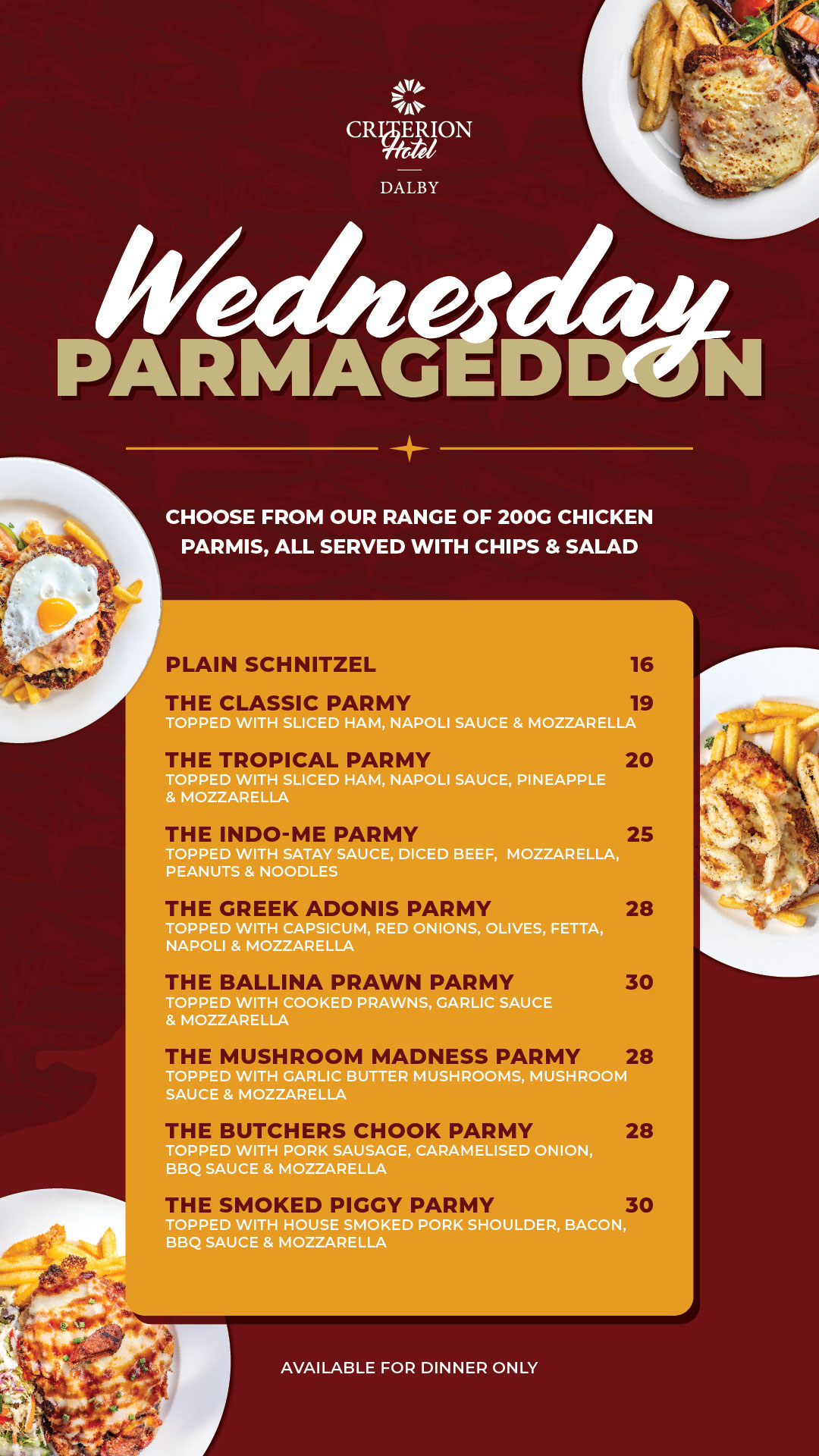 Pick your favourite parmi from our mouthwatering selection of 200g chicken parmis for just $20— from classic to loaded, we’ve got it all. Served with crunchy chips and a fresh salad to round out the meal! View our parmy selection menu here.